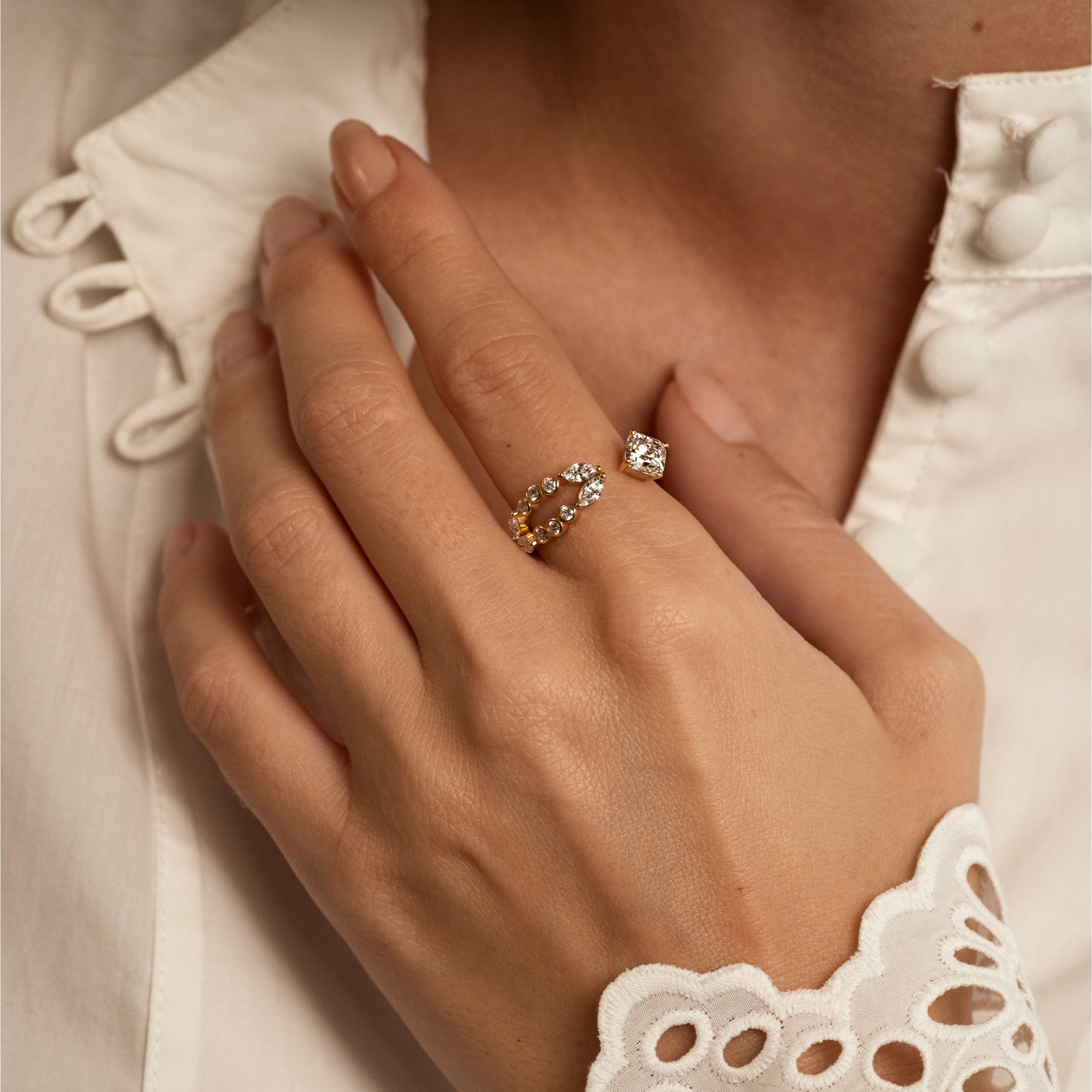 In this visual symphony, the central diamond is ennobled by a crown of pavé diamonds. The encircled solitaire creates a striking firework of light with every movement of the hand. It captivates with the softness of its curves and its shimmering harmony. An ideal engagement ring to envelop your ardent love in a soft setting.
