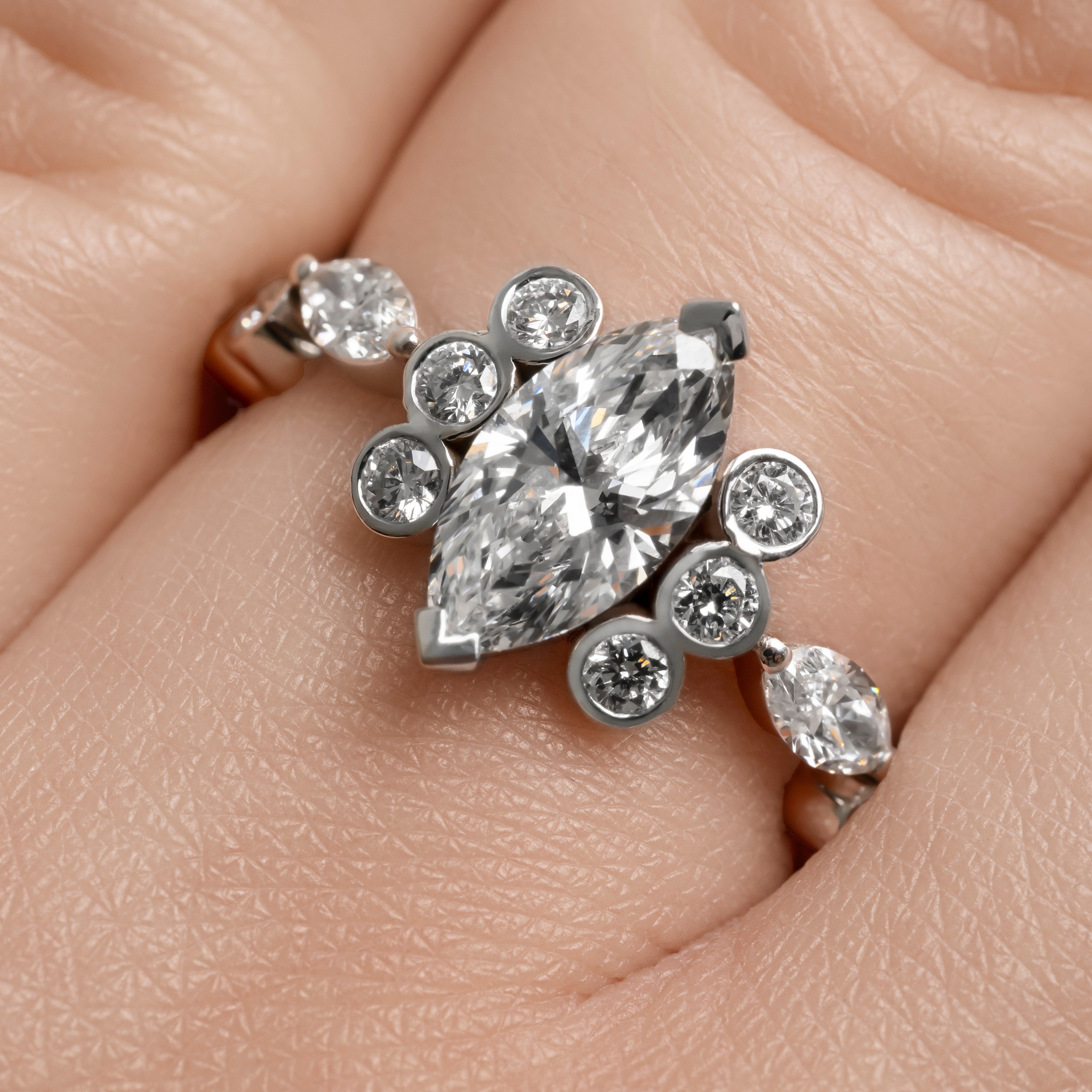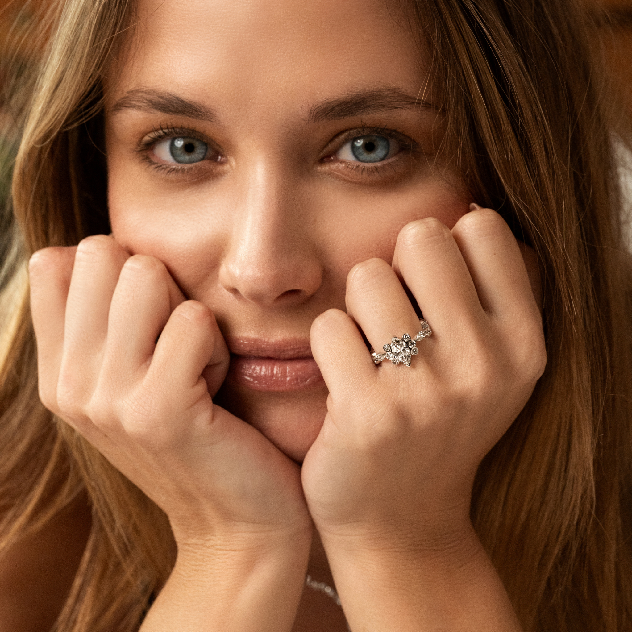 The Paloma Solitaire engagement ring shown here is set with a 1.0 carat center diamond and 18 1.5mm brilliant diamonds.