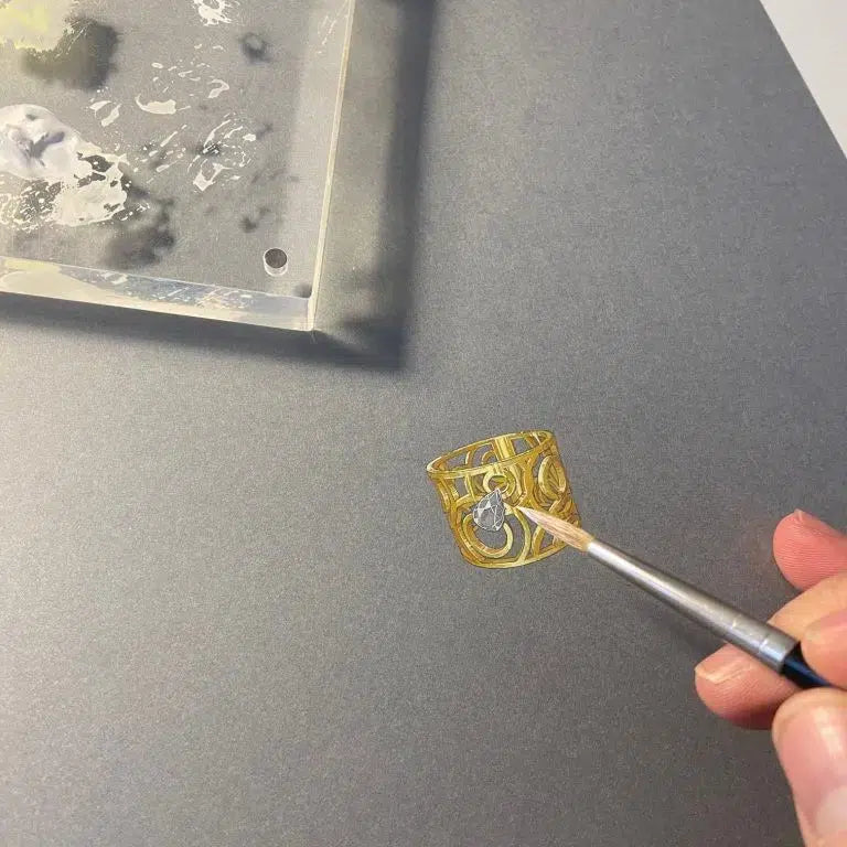 Tout débute par une idée, une inspiration. Un voyage, un film, un poème : tout est prétexte à l’imaginaire et la création. Des images, des mots et objets sont rassemblés afin de former une planche d’inspiration, un moodboard. De ces inspirations naissent les premiers croquis. Ces dessins sont retravaillés, affinés au grès de nos réflexions. Après plusieurs va-et-vient, nous aboutissons à un dessin technique précis pour chacune de nos pièces de joaillerie. Le design est créé.