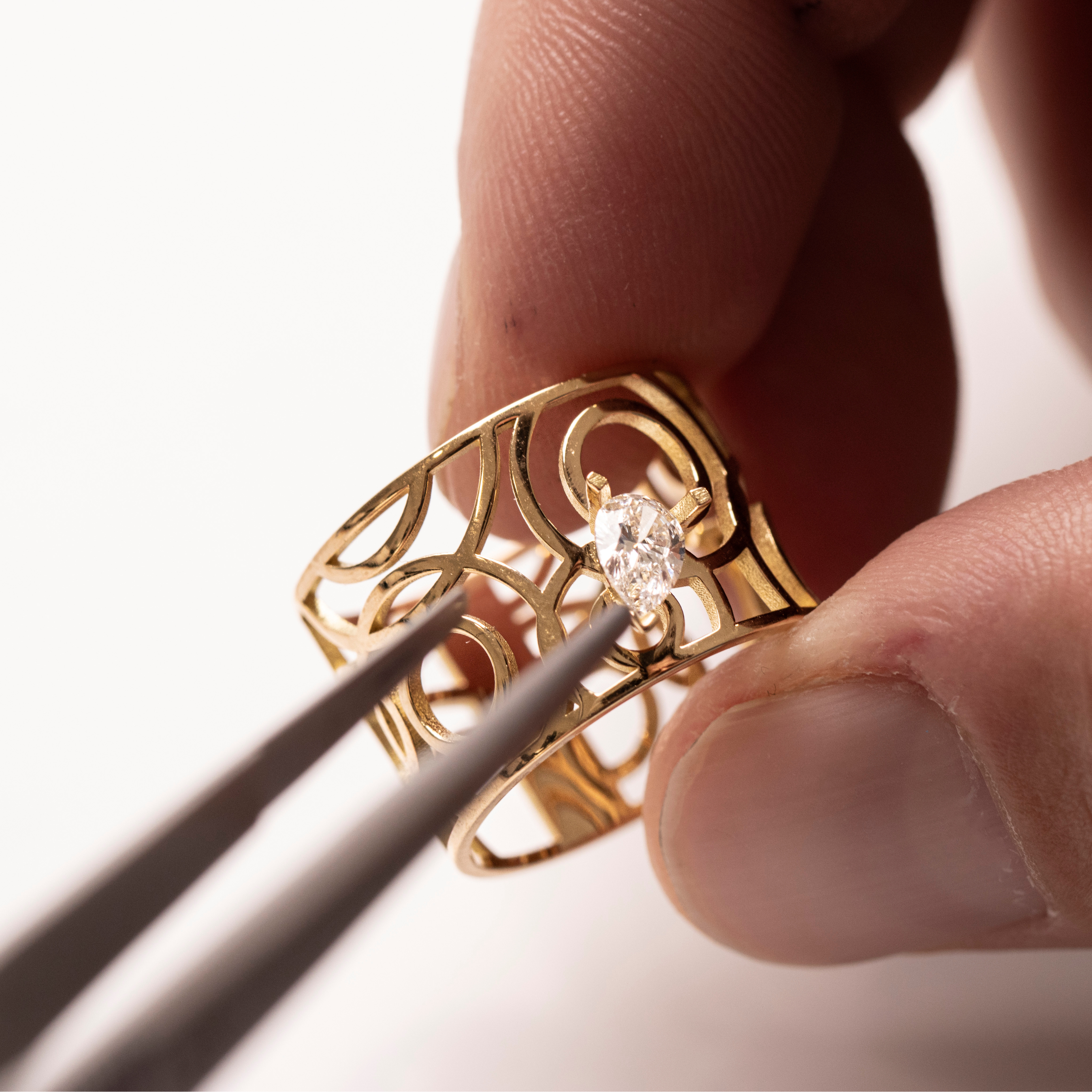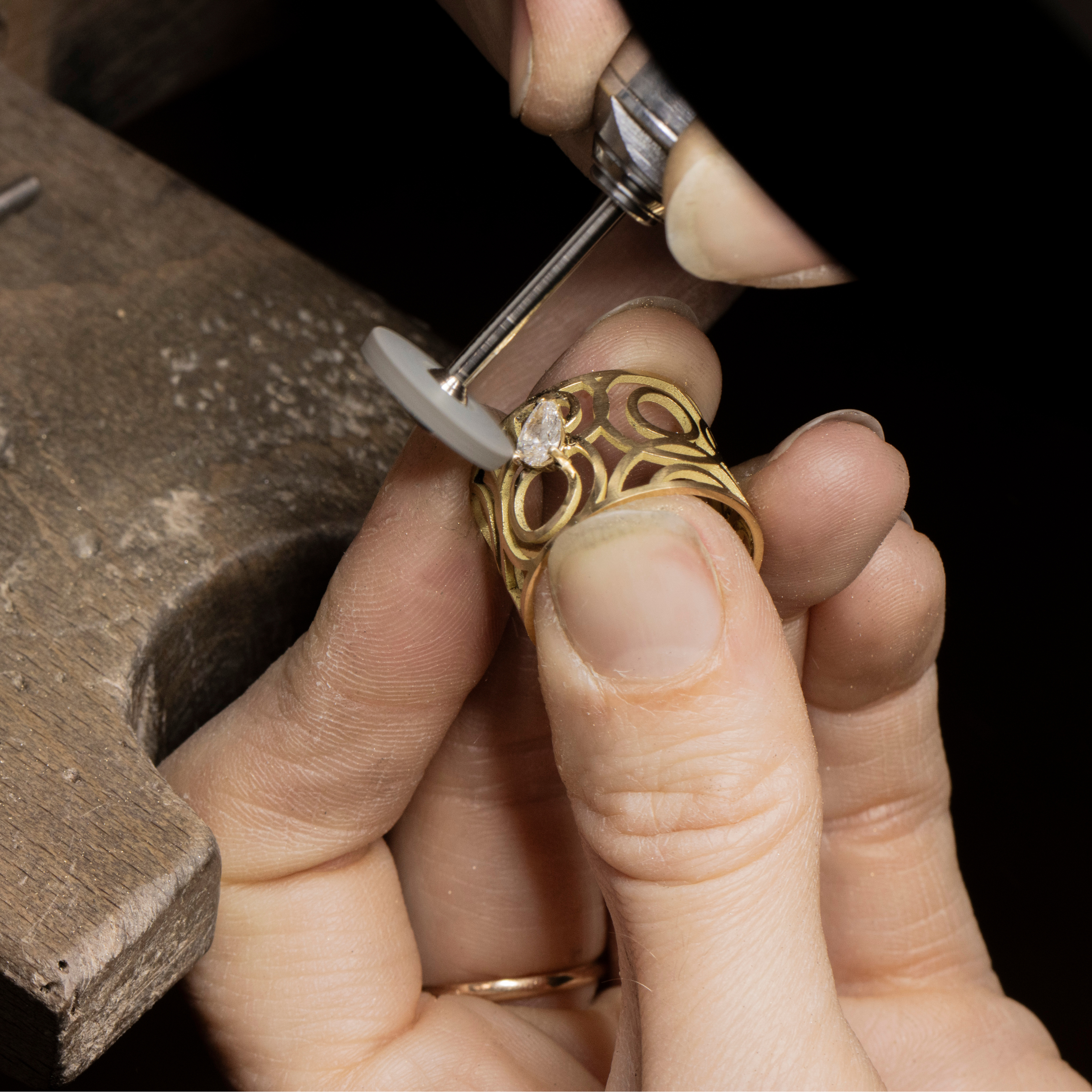 Le bijou passe ensuite entre les mains du sertisseur. Celui-ci fixe nos diamants de synthèse sur la monture en or. Cette étape minutieuse est particulièrement complexe puisqu’il existe une multitude de sertis : griffe, clos, grain…Tout l’enjeu ici est de mettre en valeur le plus possible la pierre, tout en lui assurant une fixation parfaite.